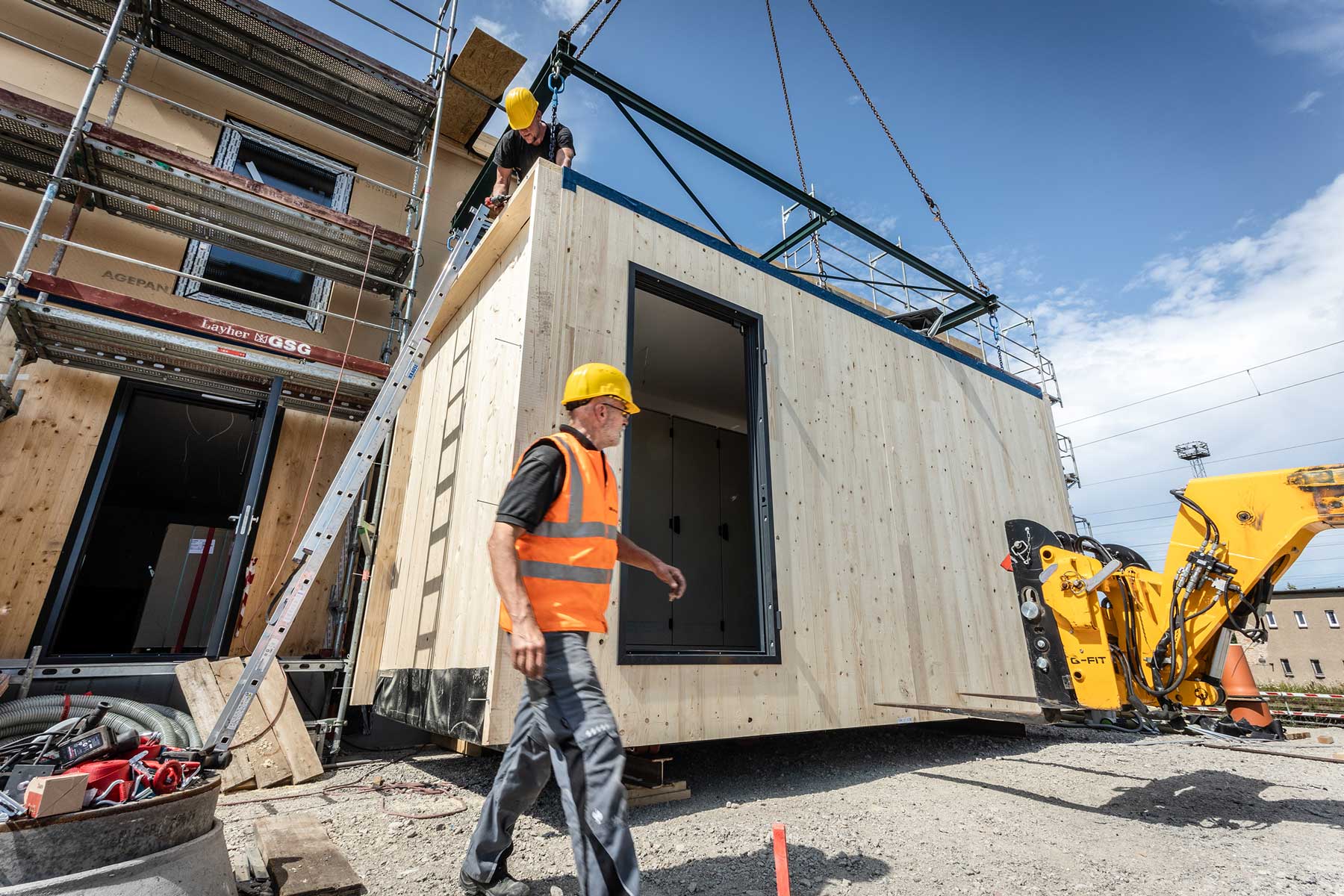 Das von uns verwendete Nadelholz ist ein Rohstoff, der schnell nachwächst und auch kurzfristig in großen Mengen verfügbar ist. Im Vergleich zu Betonbauten bietet Fichtenholz eine hervorragende CO₂-Bilanz und sehr gute Dämmeigenschaften. Eine zusätzliche Dämmung in den Technikmodulen ist bei unserer Bauweise oft nicht notwendig, was die Umweltbelastung weiter reduziert.